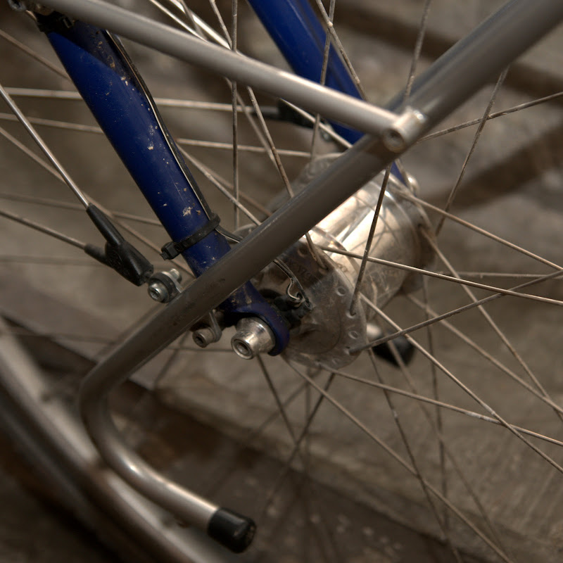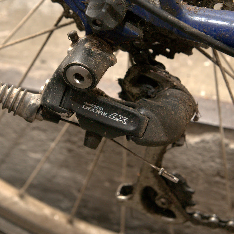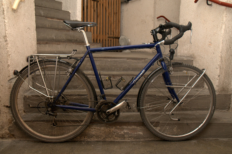 Der silberne Gepäckträger, der mal ursprünglich auf meinem T900 montiert war, und das fehlende Bügelschloß machen das Rad auf einmal erheblich leichter... Im Winter fahre ich das Rad bei Glatteis mit Spikereifen. Umwerfer und Schaltwerk sind von einem Rad aus dem Jahr 1995.