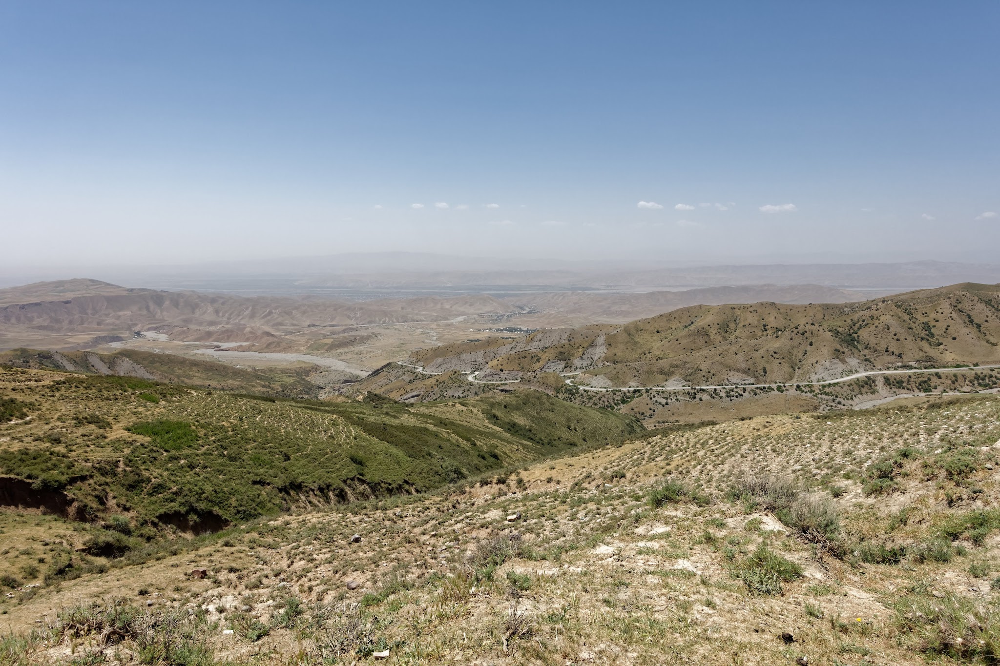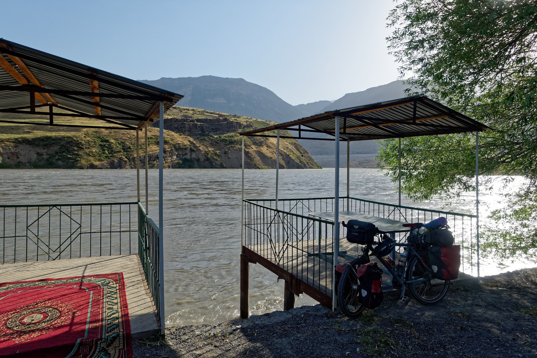 After a first night with a stunning view over the nurek lake, Michael's bike fork just didn't want to continue the journey. Since there was no way to repair it, he had to go back to Dushanbe and to get new one. After the repair he tried to catch up with Andi who meanwhile had continued to kulobod and the panj river. On the way there the driver, first went home to get a spare wheel and then after a about 200km just stopped and said 'gas problem', went out to check the engine and continued But finally, after repairing the front rack on the way to the meeting point, Michael could catch up with Andi and we had a very nice place to stay on a plateau over the panj River with direct view to Afghanistan! !Spoiler alarm! Bad roads ahead causing extensive material testing.