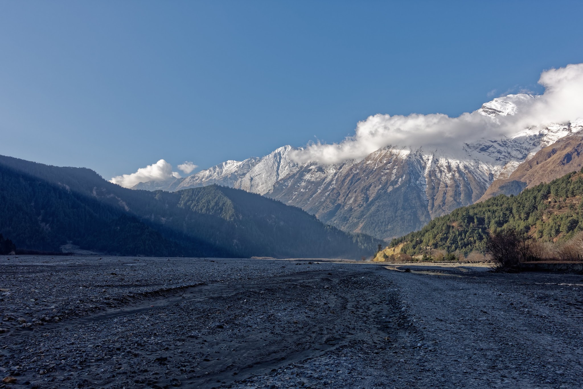 Marpha to Tatopani Tato=hot, pani=water. Sometimes you have to look for a path in the riverbed of Kali Gandaki. Nice views to Dhaulagiri (8167m).