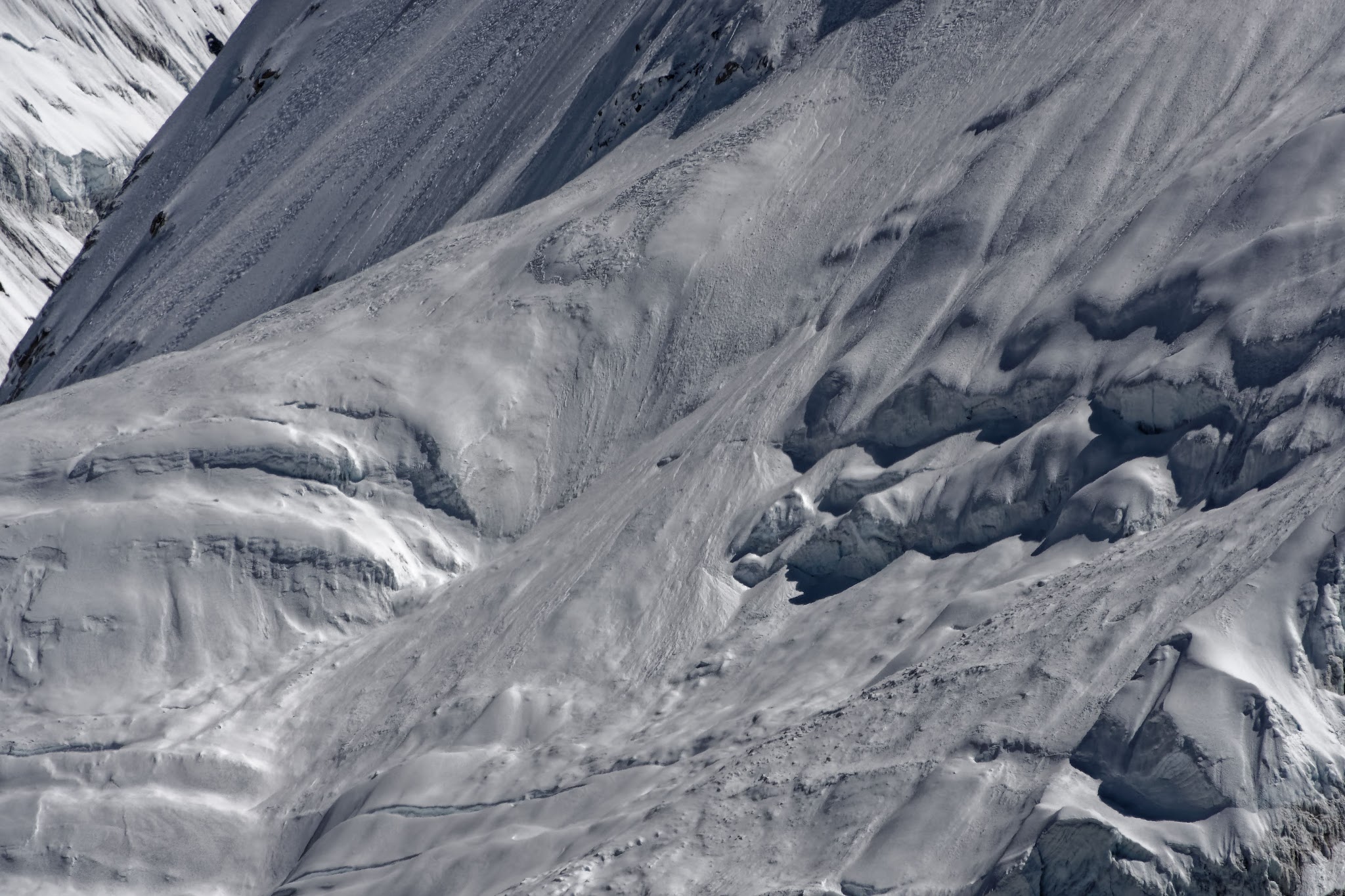 Next day the first pass of three: Kongma La. Some people start very early in the morning, unless you want to see the sun rise it is not really necessary. Above the view to Lhotse (left) and Makalu (right) on the way up. There are no facilities along the way and not much water, so bring a packed lunch from your lodge in Chhukung and fill your water bottle when you can. The trail climbs the hill diagonally northwest of the Chhukung Resort over the outflows of the Nuptse Glacier. The first five minutes are confusing so ask your lodge for directions to the start of the path. On the first stage of the trek, there are great views back across the valley to Island Peak and the jagged ridge of Amphu Lapcha. The trail curves around the hillside above Bibre and then climbs along the east side of the Niyang Khola Valley, beneath a menacing wall of black rock. At the head of the valley, the path swings west, scrabbling its way up a steep slope littered with boulders. Snow often lingers on this north-facing slope, making it tricky to find the icy trail. Af the top of the bluff the trail swings around past a small lake and ascends into a wide basin, dotted with small frozen lakes. Beyond the largest lake, the trail switchbacks steeply over loose scree, gaining the Kongma La (5535m) around three hours after you left Chhukung. A cairn, mummy-wrapped in prayer flags, marks the pass. Behind you is a lunar landscape of icy lakes and frozen ridges; ahead the landscape tumbles down to the Khumbu Glacier. There are incredible views east towards giant Makalu, with peaks in Tibet visible to its left. The final descent is the most difficult stage of the trek. Ignore the faint path running directly downhill to the tiny pool below the pass and keep to the right, dropping steeply down the scree and icy boulders for two hours to more solid ground on the edge of the moraine. Ice can make this section very slippery. The next stage across the glacier is a final sucker punch, with lots of ups an downs – follow the stone cairns along the ever-shifting route and climb the moraine on the far side, where a clear trail runs north to Lobuche.