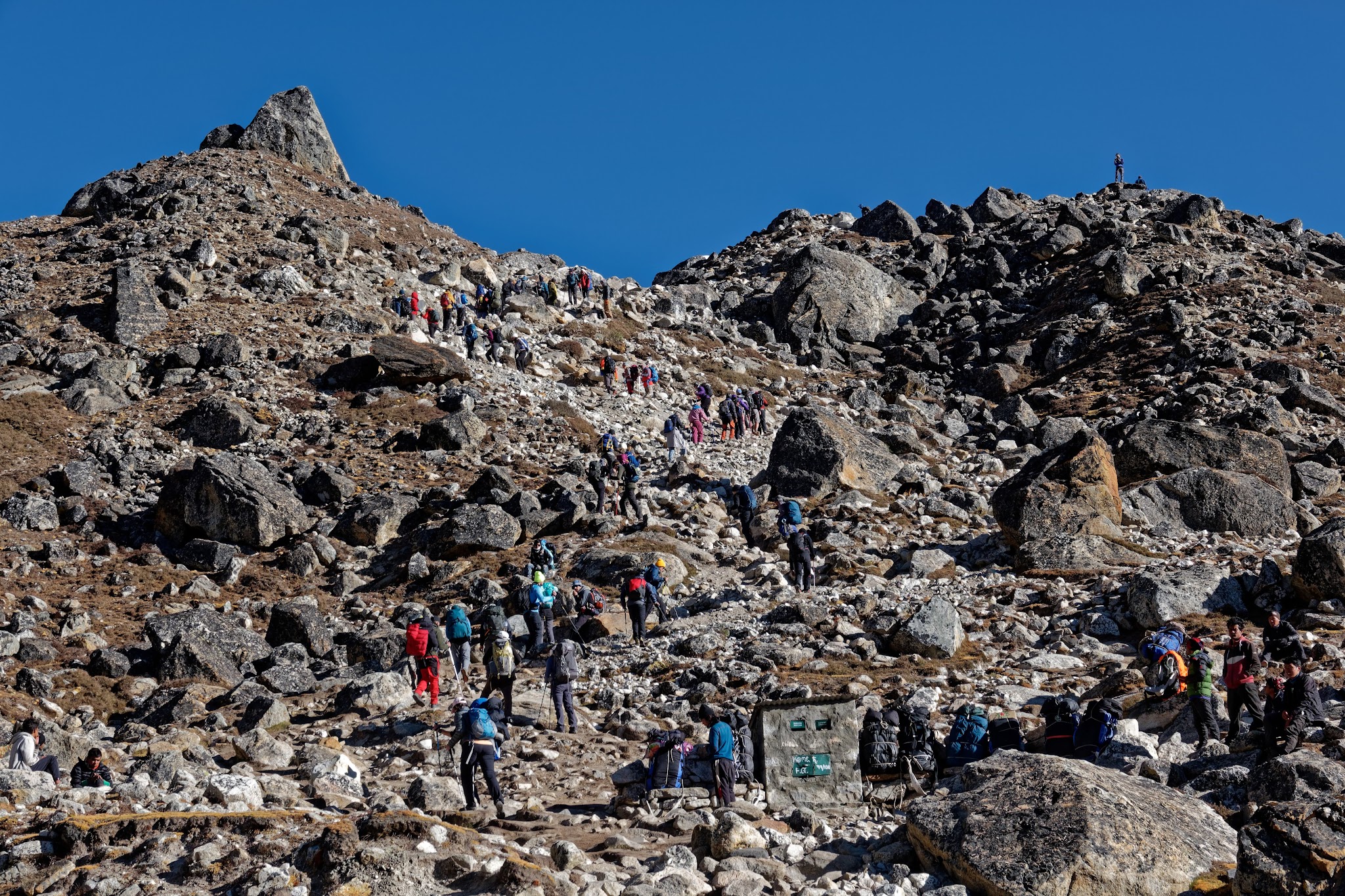 I stayed for two nights in Lobuche and made a day trip to Gorak Shep (2,5h) and Kala Patthar, another 2h and was not alone as you can see, but I did not have to look for accommodation with all the EBC trekkers, but most of them have guides, porters and flock together in groups.
