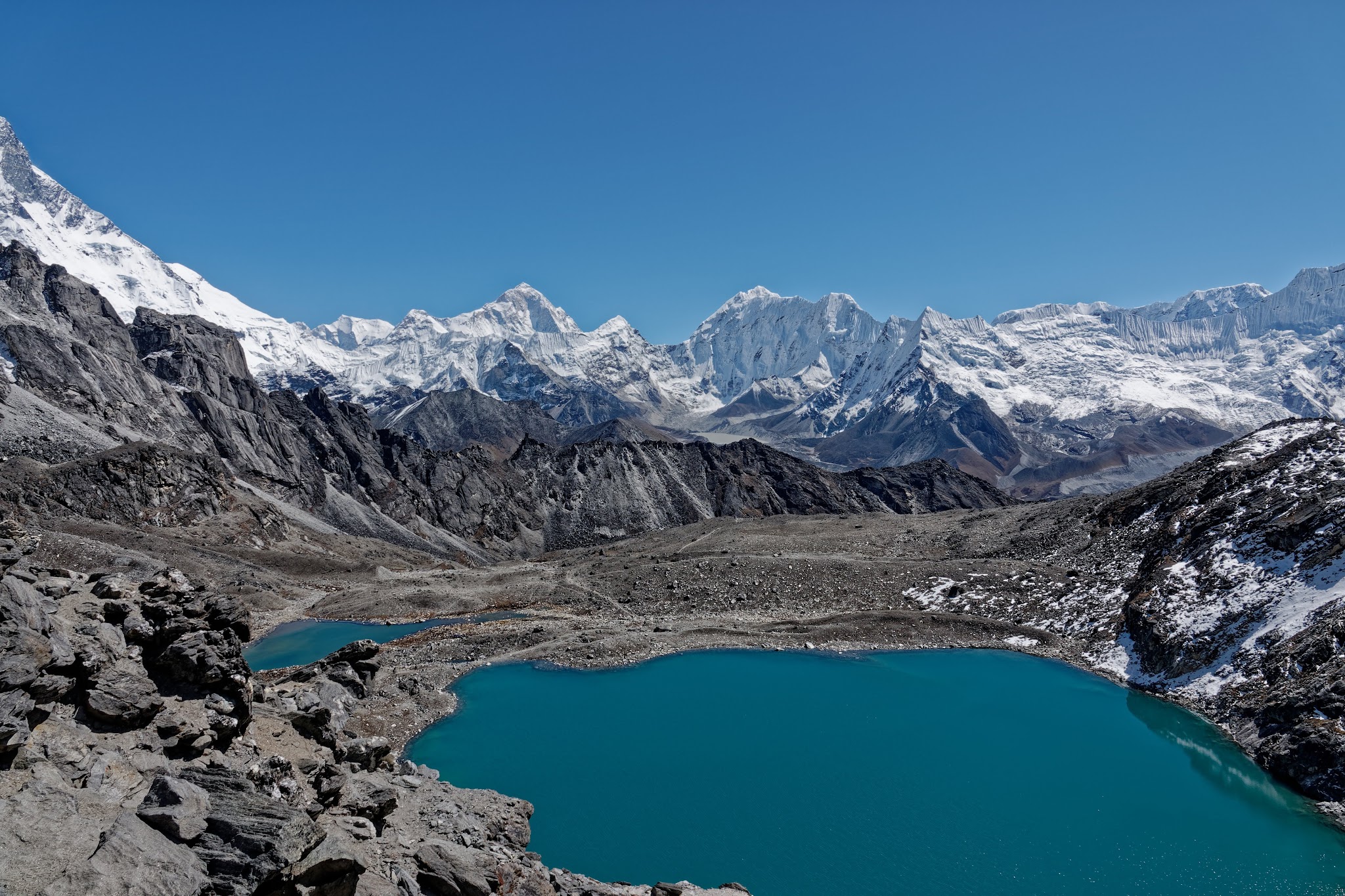 Af the top of the bluff the trail swings around past a small lake and ascends into a wide basin, dotted with small frozen lakes. Beyond the largest lake, the trail switchbacks steeply over loose scree, gaining the Kongma La (5535m) around three hours after you left Chhukung. A cairn, mummy-wrapped in prayer flags, marks the pass. Behind you is a lunar landscape of icy lakes and frozen ridges; ahead the landscape tumbles down to the Khumbu Glacier. There are incredible views east towards giant Makalu, with peaks in Tibet visible to its left.