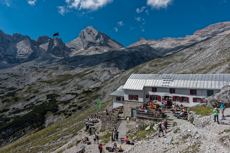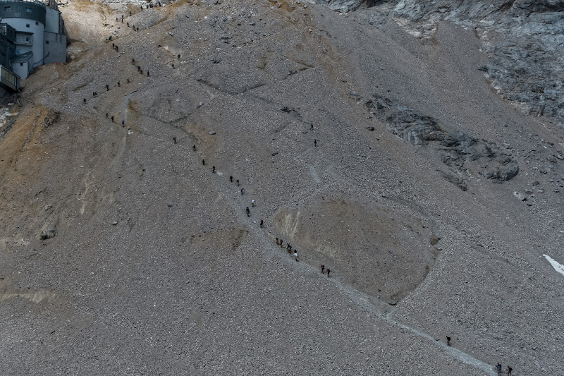Mit dem ersten Zug um 5:30 von München Hbf nach Garmisch-Partenkirchen und nach knapp 30min, vorbei am Skistadion, ist man am Anfang der Partnachklamm. Nach weiteren 11,4 Kilometern entlang der Partnach durch den Wald erreicht man die Reintalangerhütte. Von dort zur Knorrhütte überwindet man einige Höhenmeter, ich hab wegen der vielen Leute die dort um Essen/Trinken anstanden auf eine Brotzeit verzichtet. Weiter gehts zum Zugspitzplatt und von dort das steile Geröll-/Schneefeld am Schneefernerhaus vorbei hoch zum Münchner Haus. Wegen der langen Wartezeiten auf einen Platz in der Eibseeseilbahn nahm ich den Weg mit der Gletscherbahn zum Zugspitzplatt und Zahnradbahn nach Garmisch-Partenkirchen. Kosten: 19euro Werdenfelsticket + 31,50euro einfache Fahrt mit den Zugspitzbahnen runter.