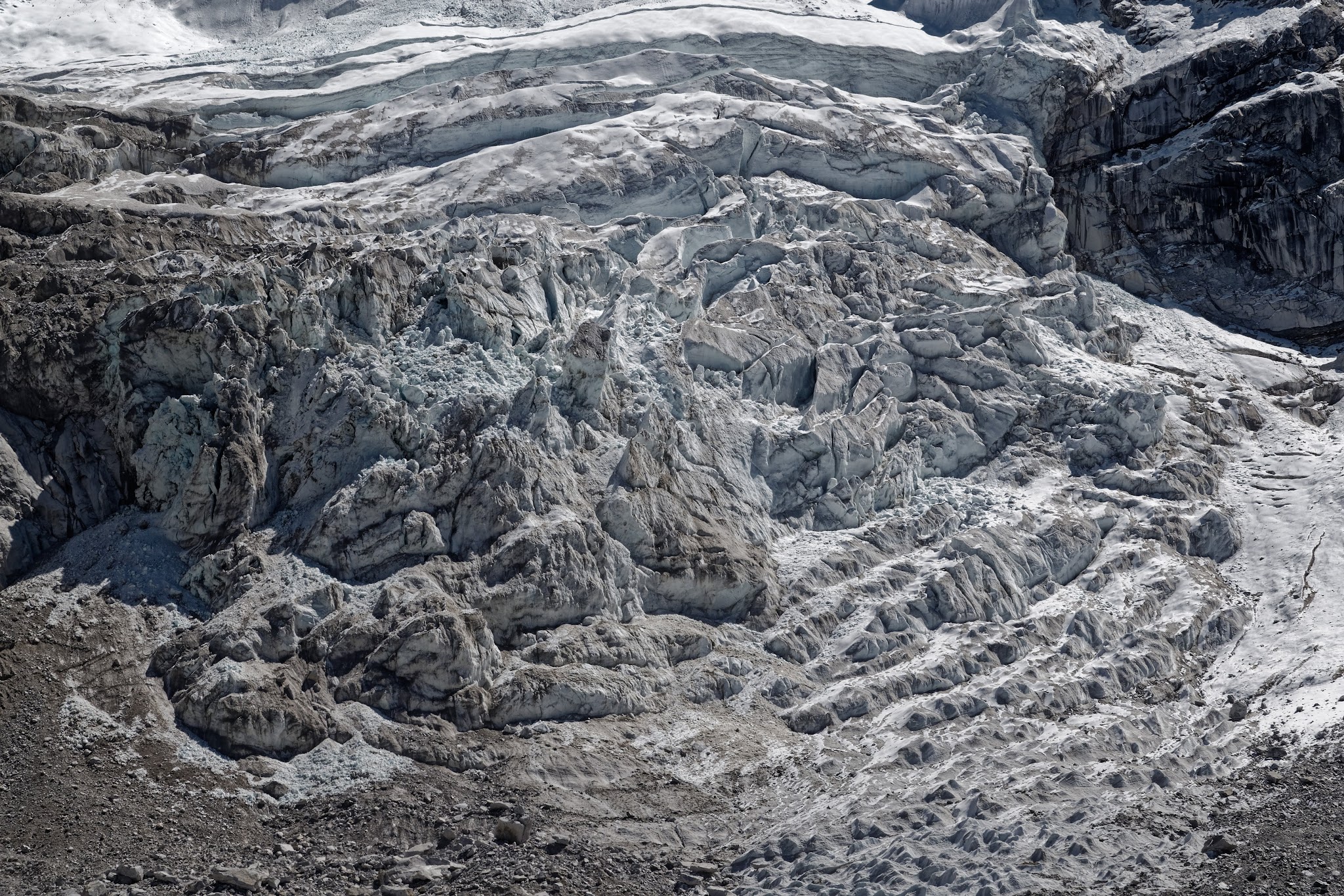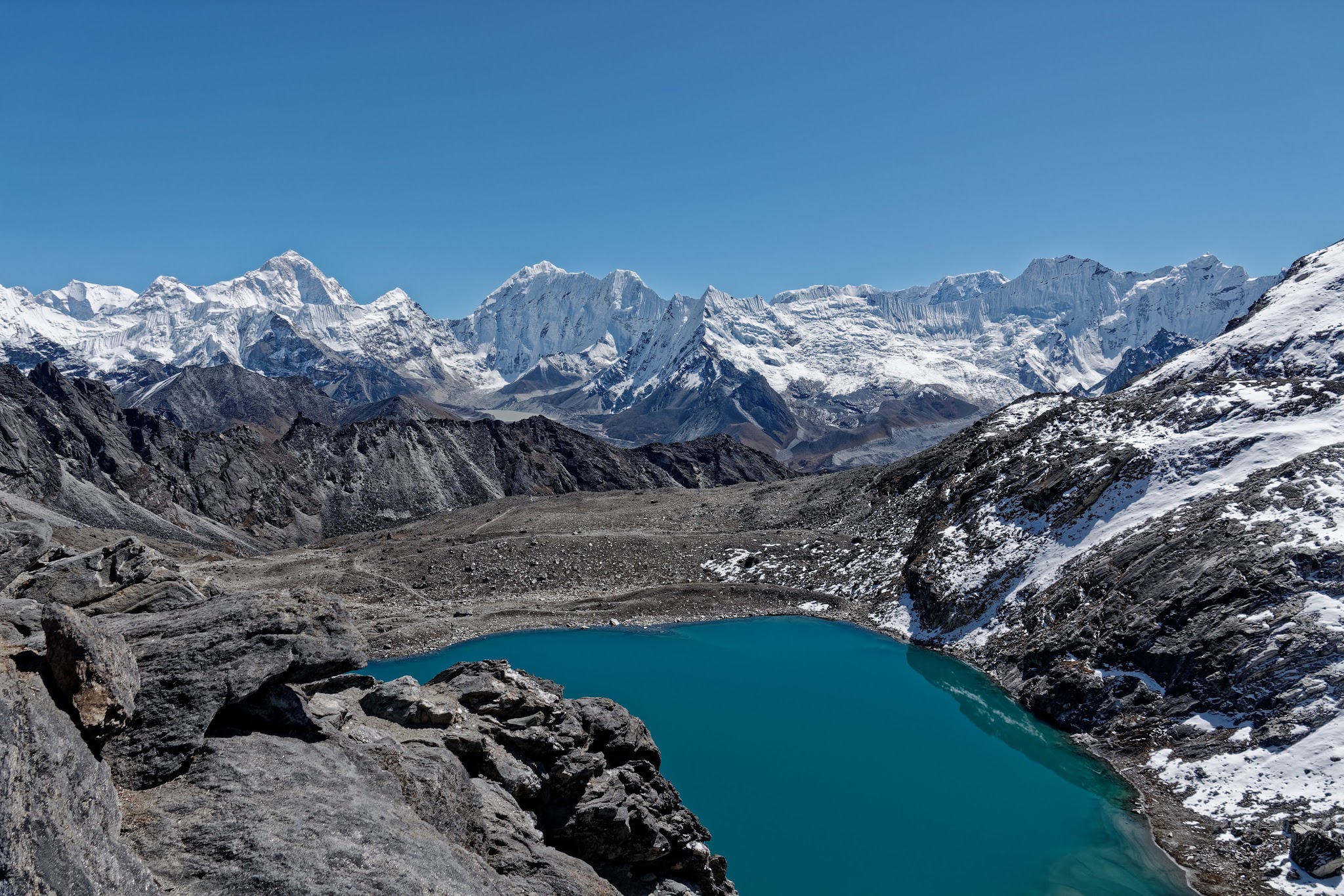 The final descent is the most difficult stage of the trek. Ignore the faint path running directly downhill to the tiny pool below the pass and keep to the right, dropping steeply down the scree and icy boulders for two hours to more solid ground on the edge of the moraine. Ice can make this section very slippery.