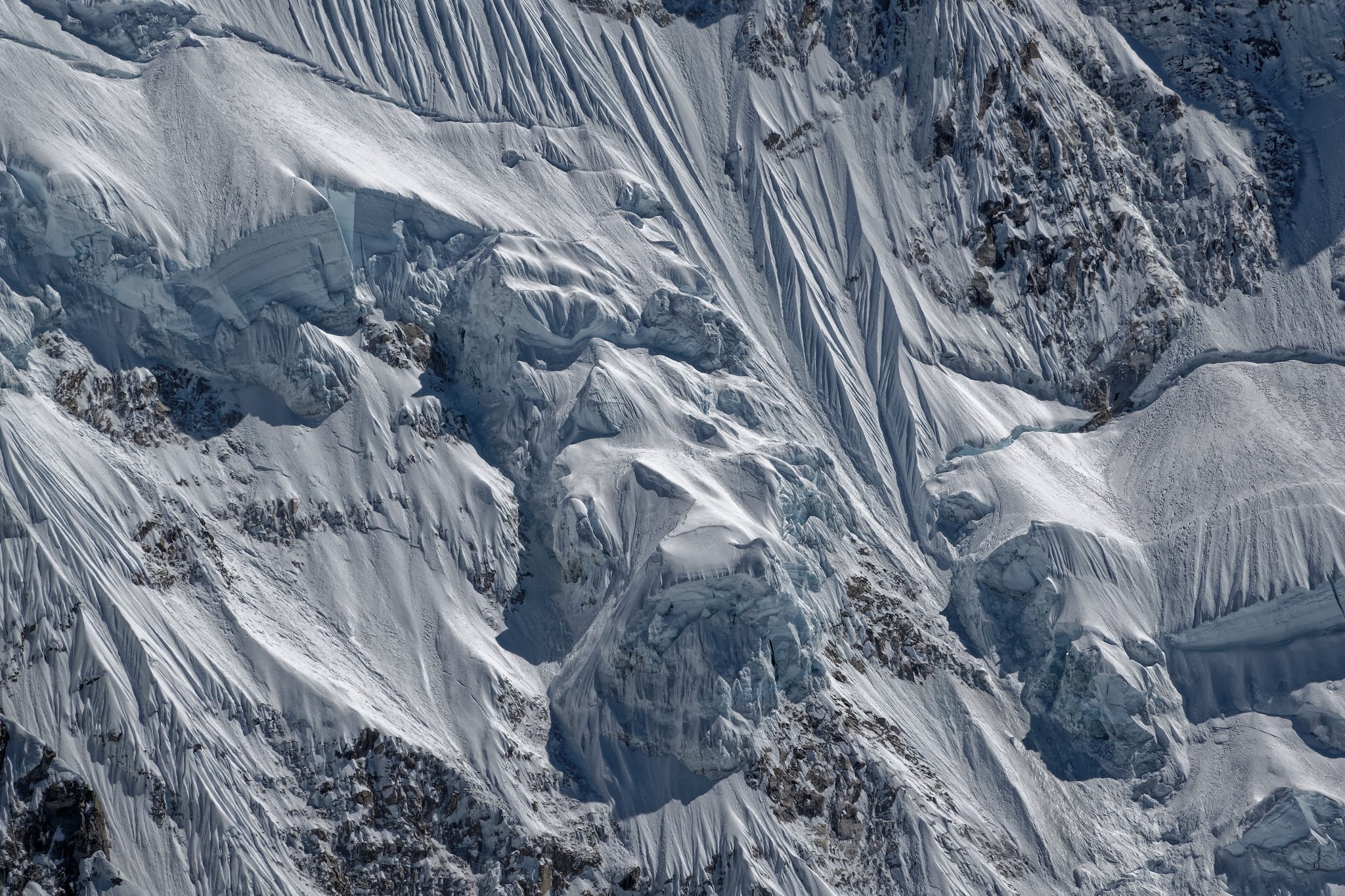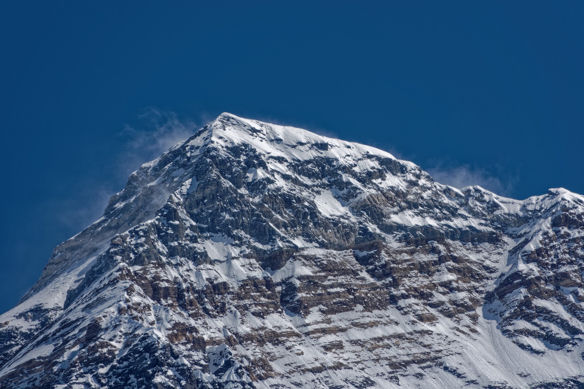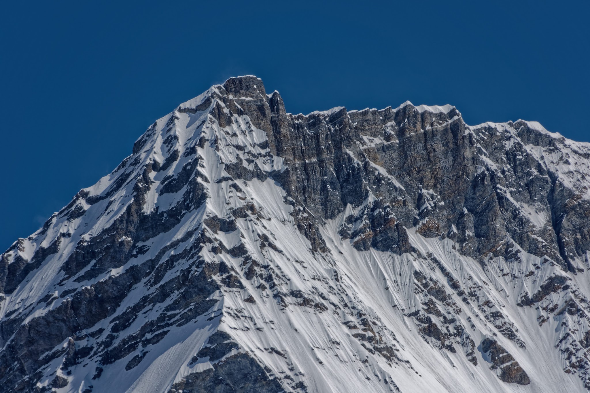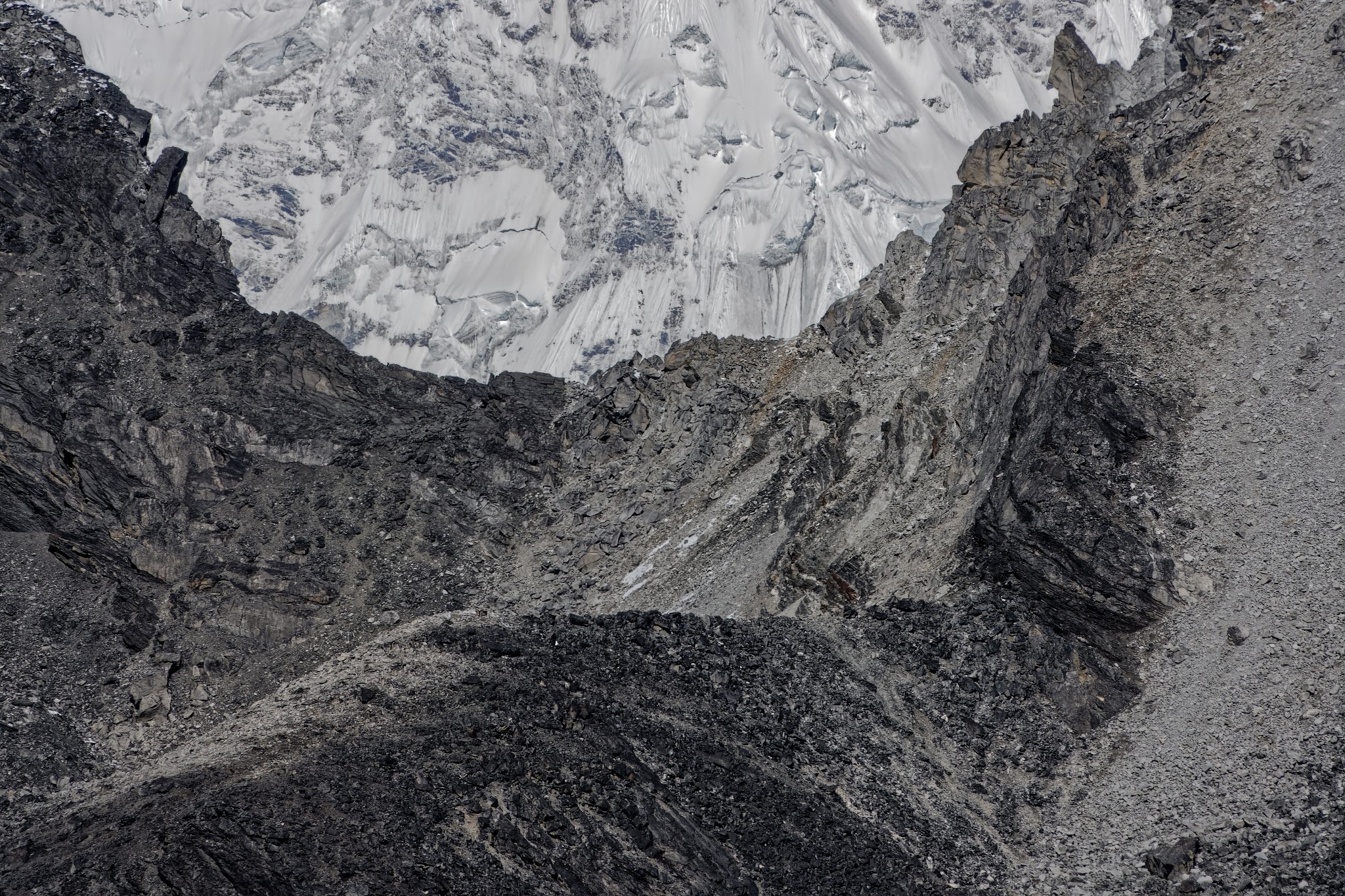 The trail curves around the hillside above Bibre and then climbs along the east side of the Niyang Khola Valley, beneath a menacing wall of black rock. At the head of the valley, the path swings west, scrabbling its way up a steep slope littered with boulders. Snow often lingers on this north-facing slope, making it tricky to find the icy trail.