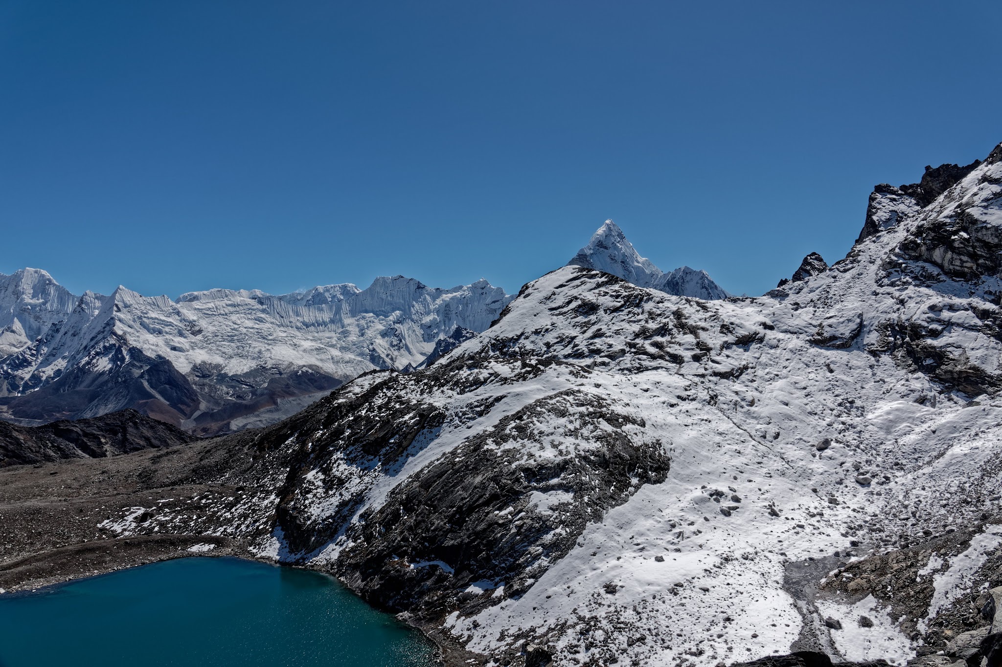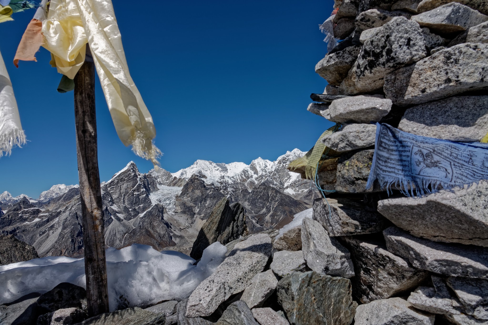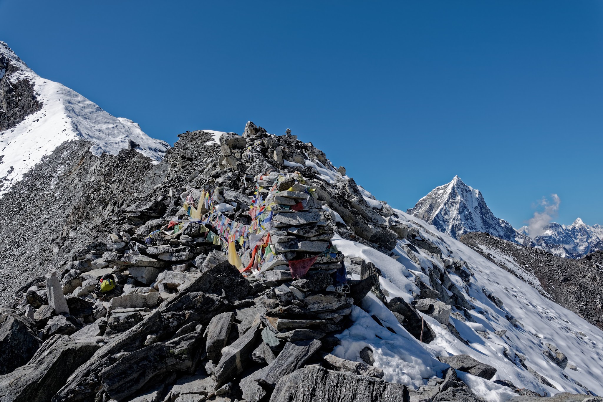 Af the top of the bluff the trail swings around past a small lake and ascends into a wide basin, dotted with small frozen lakes. Beyond the largest lake, the trail switchbacks steeply over loose scree, gaining the Kongma La (5535m) around three hours after you left Chhukung. A cairn, mummy-wrapped in prayer flags, marks the pass. Behind you is a lunar landscape of icy lakes and frozen ridges; ahead the landscape tumbles down to the Khumbu Glacier. There are incredible views east towards giant Makalu, with peaks in Tibet visible to its left.