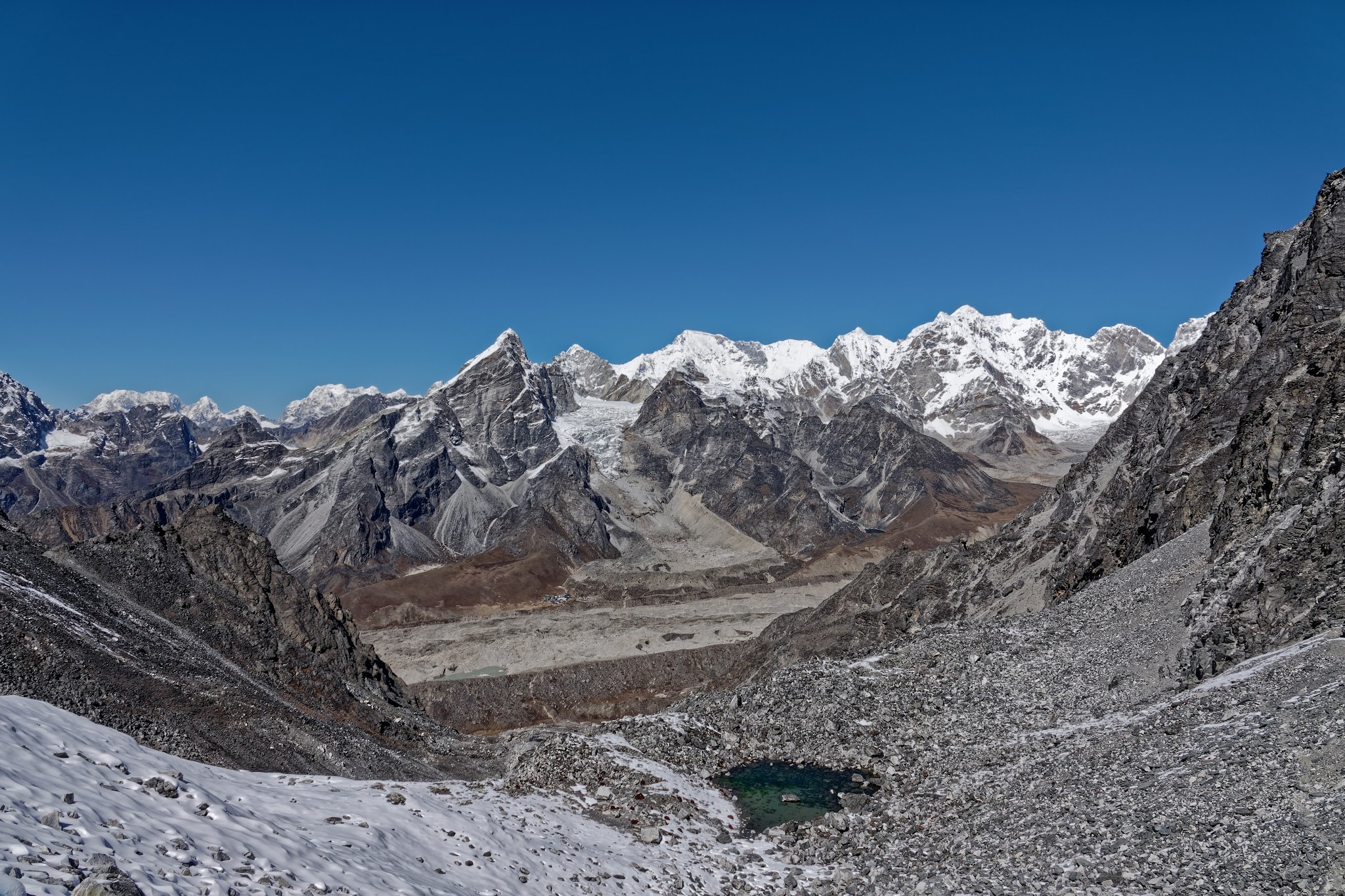 View from Kongma La to Lobuche, that is the way down, There was a bit of snow and ice on top, but the most difficult and time consuming part (as already mentioned above) was the last stretch crossing the glacier (or what is left behind by it).