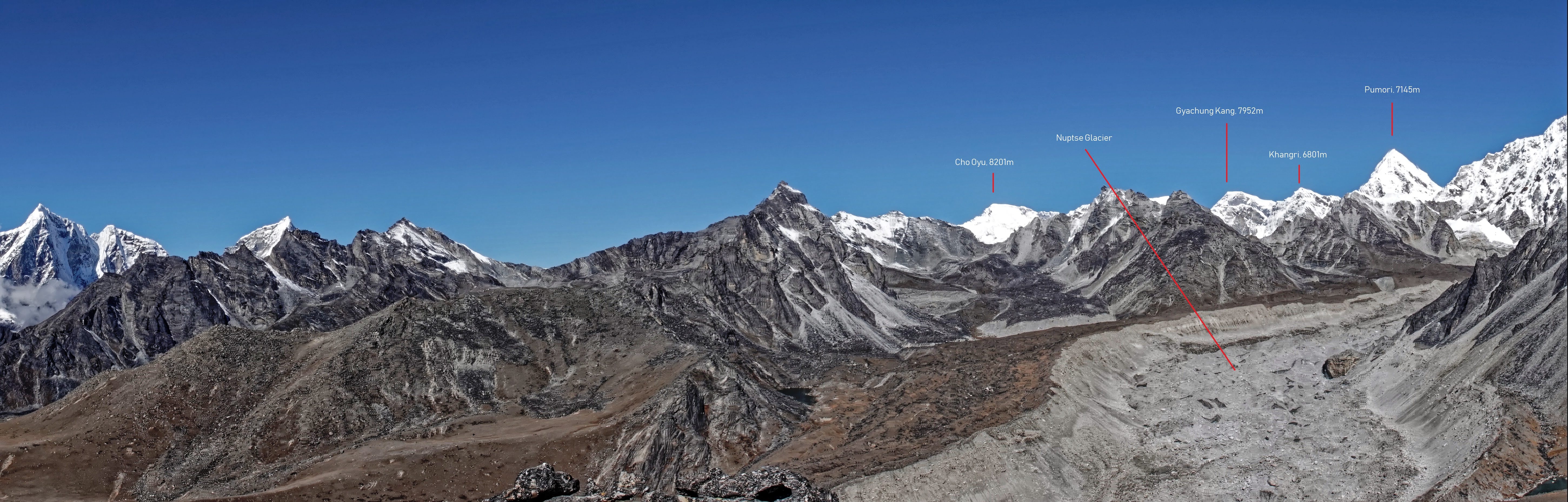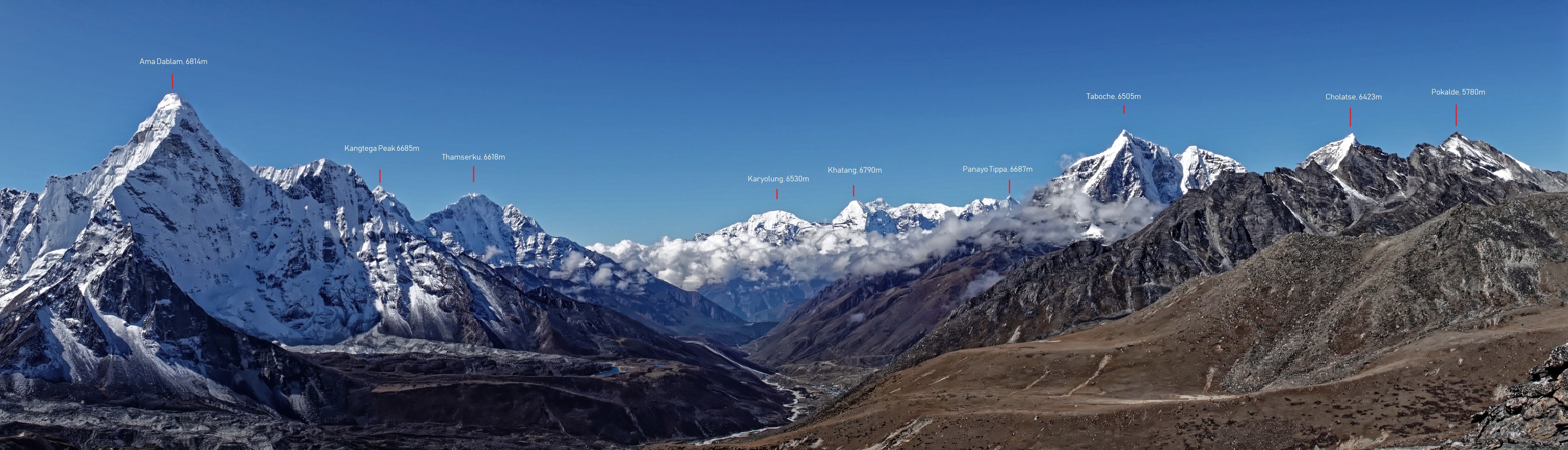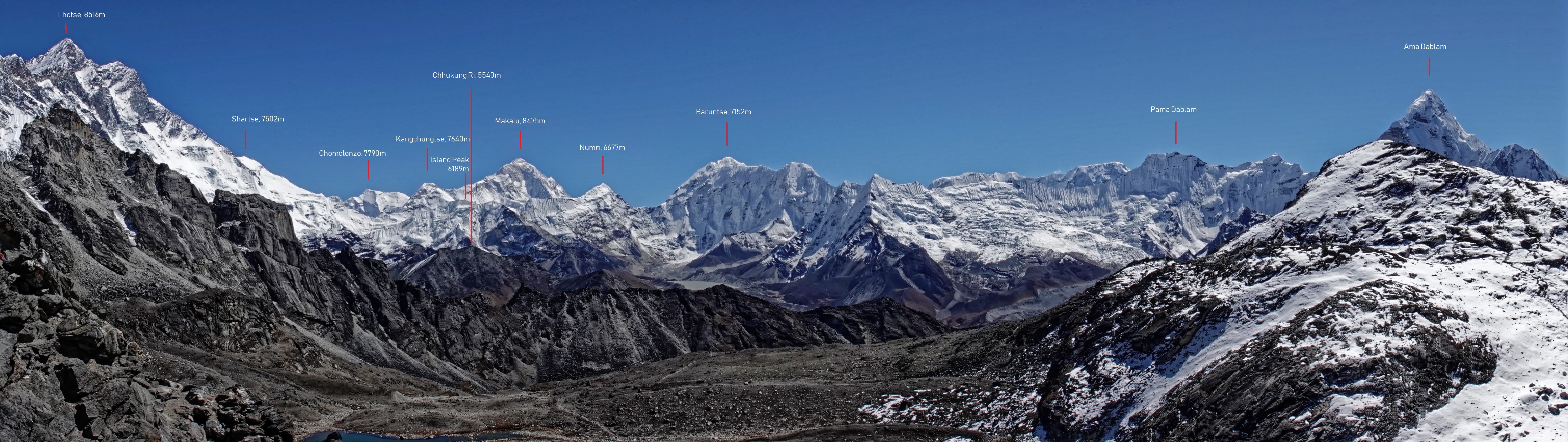 Chhukung Ri is a nice day trip from Chhukung,the next eight pictures show panoramic views. Every second picture is annotated to get a few names to all the summits...