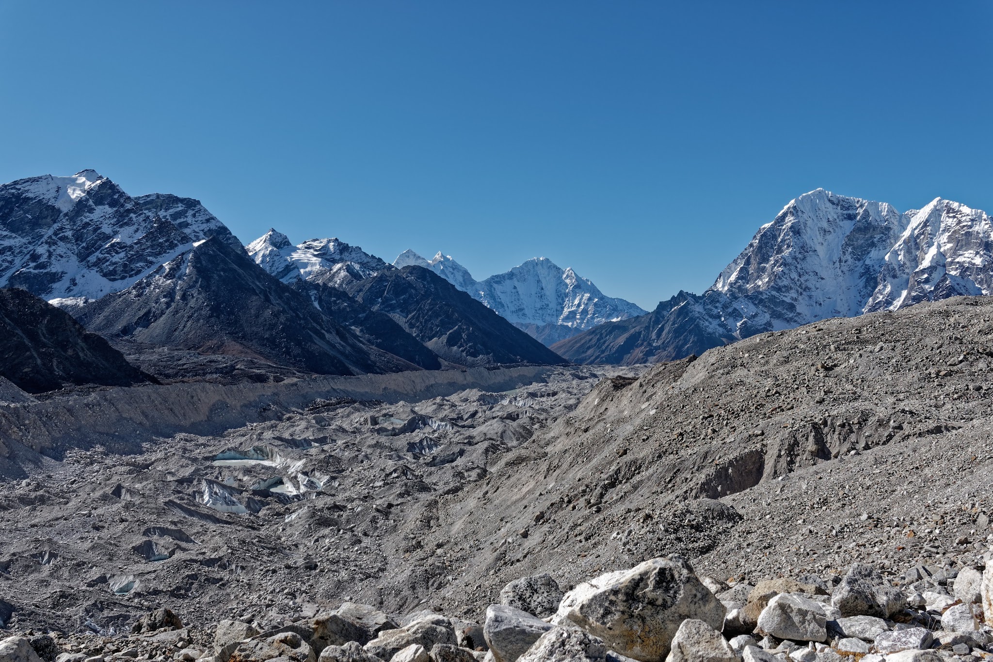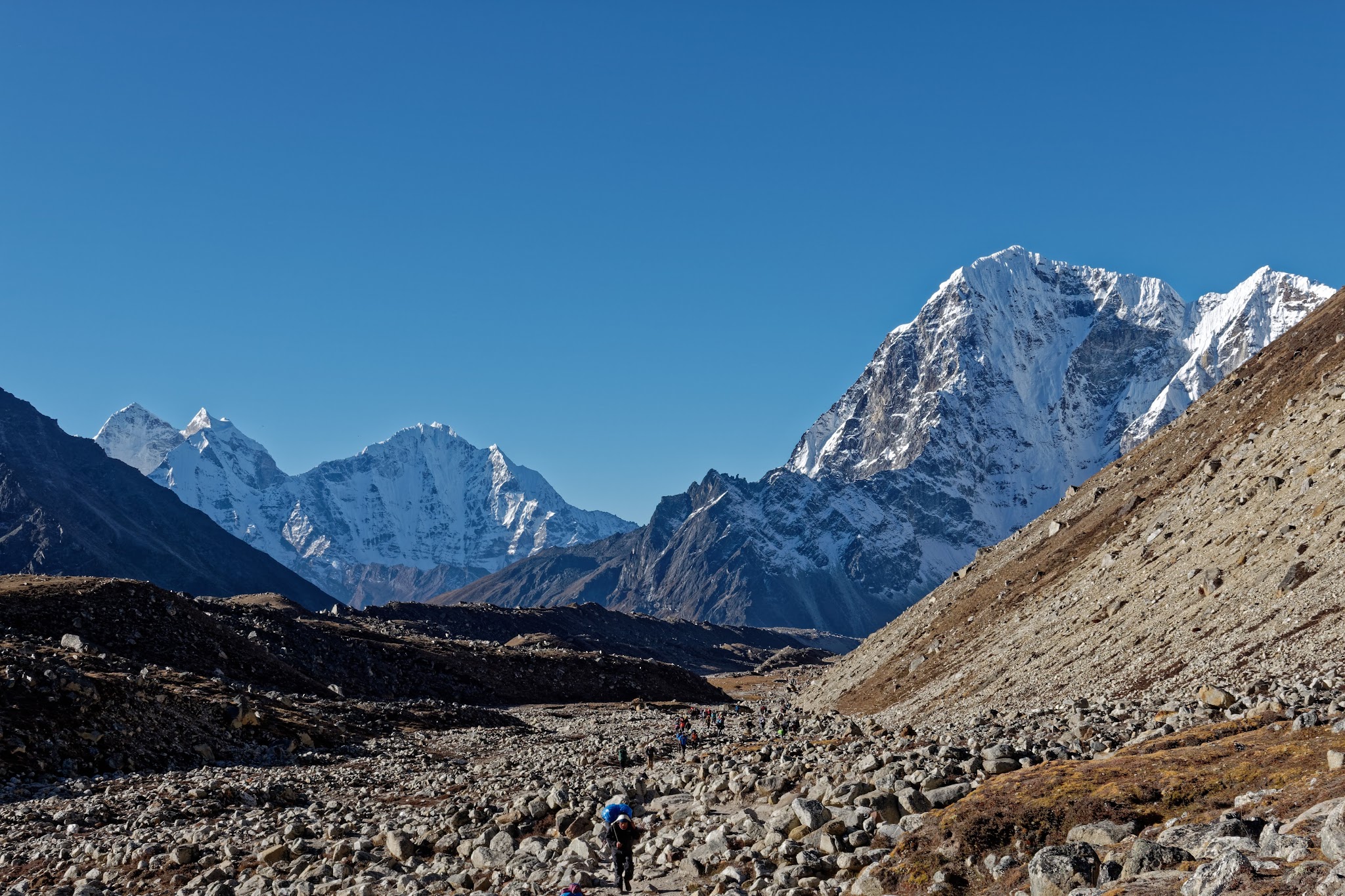 The next stage across the glacier is a final sucker punch, with lots of ups an downs – follow the stone cairns along the ever-shifting route and climb the moraine on the far side, where a clear trail runs north to Lobuche.